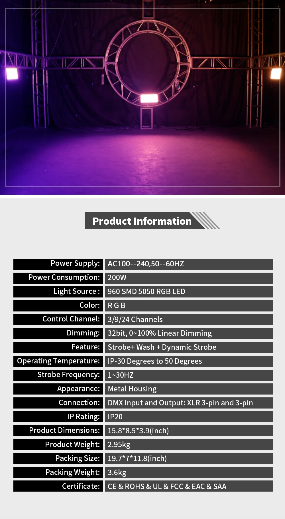 Connectiong: DMX Input and Output: XLR3 pin and 3 pin